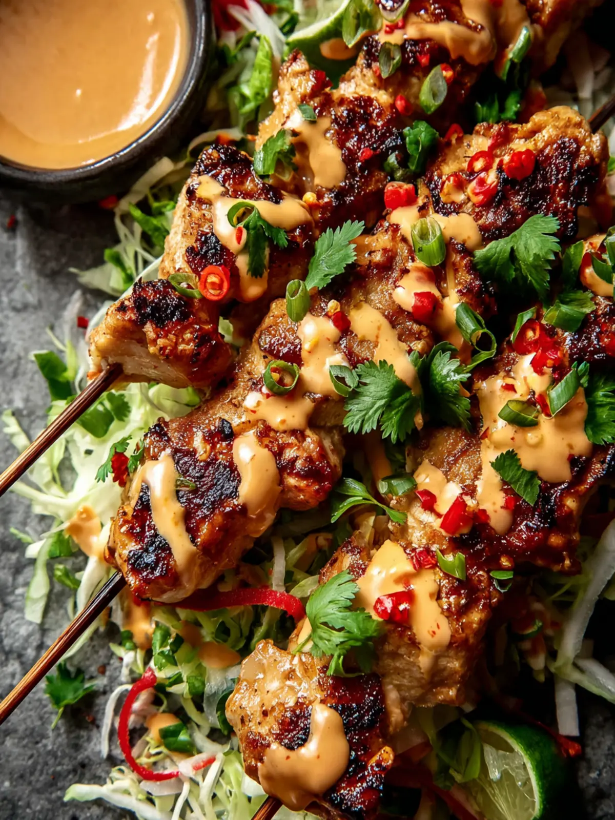 Deliciously seasoned chicken skewers coated in a creamy bang bang sauce, perfect for grilling, baking, or pan-frying.