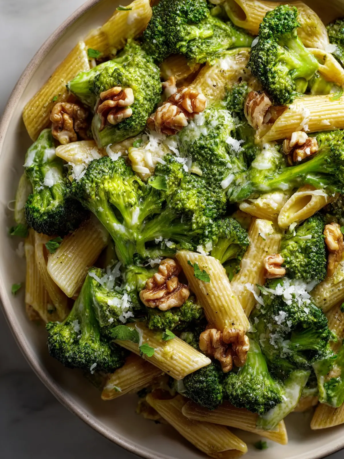 A delicious and healthy garlic broccoli pasta dish made with whole wheat pasta and topped with Parmesan and walnuts.