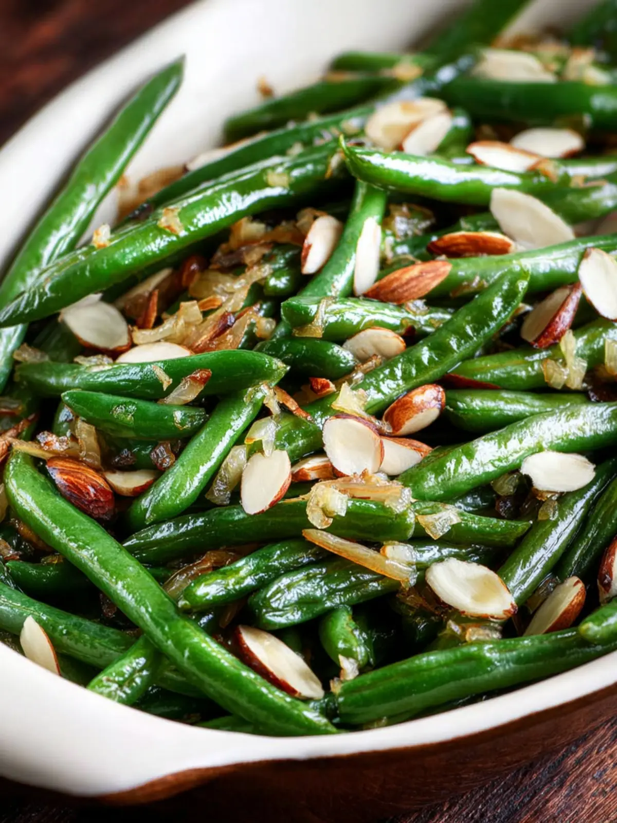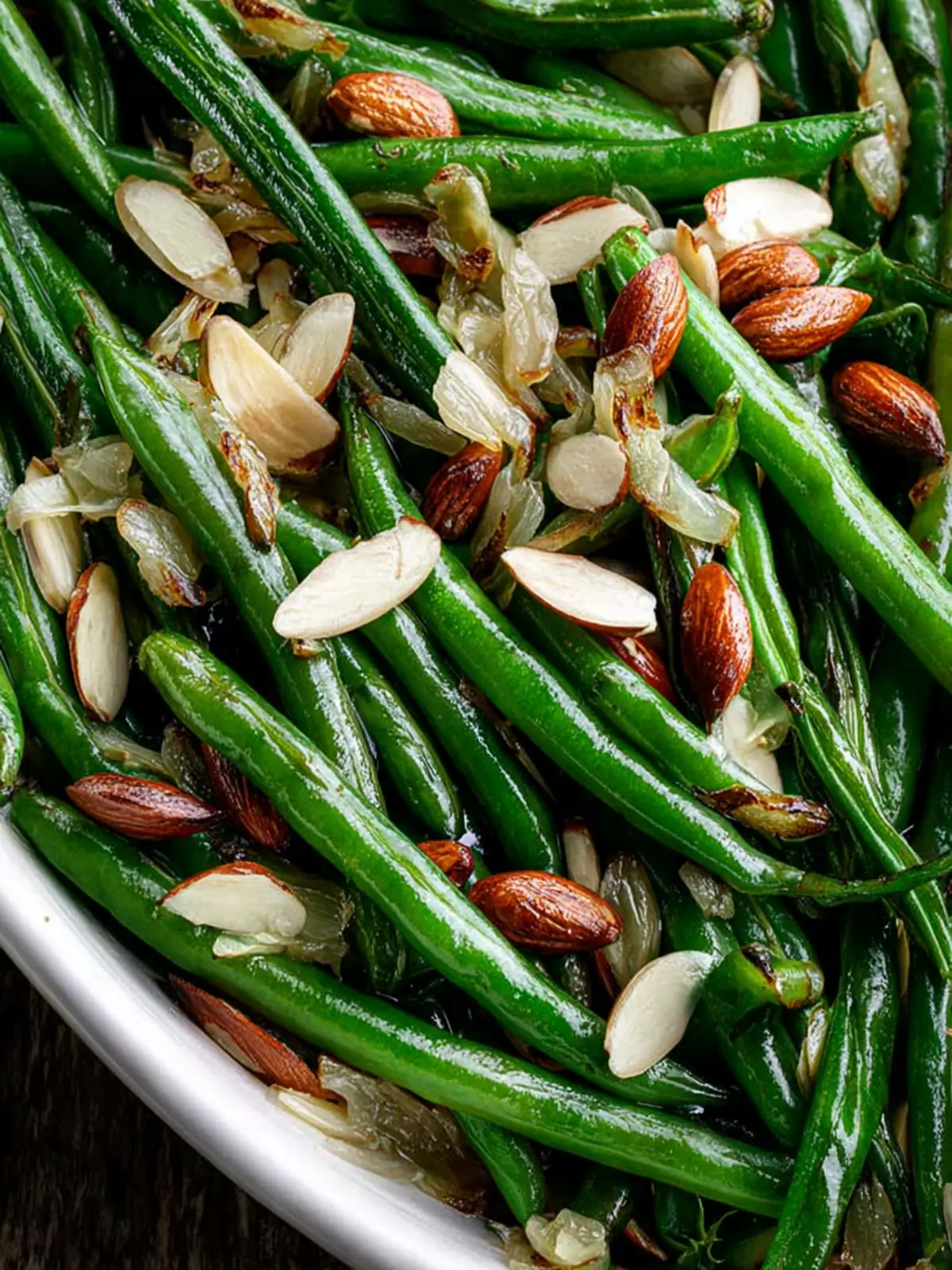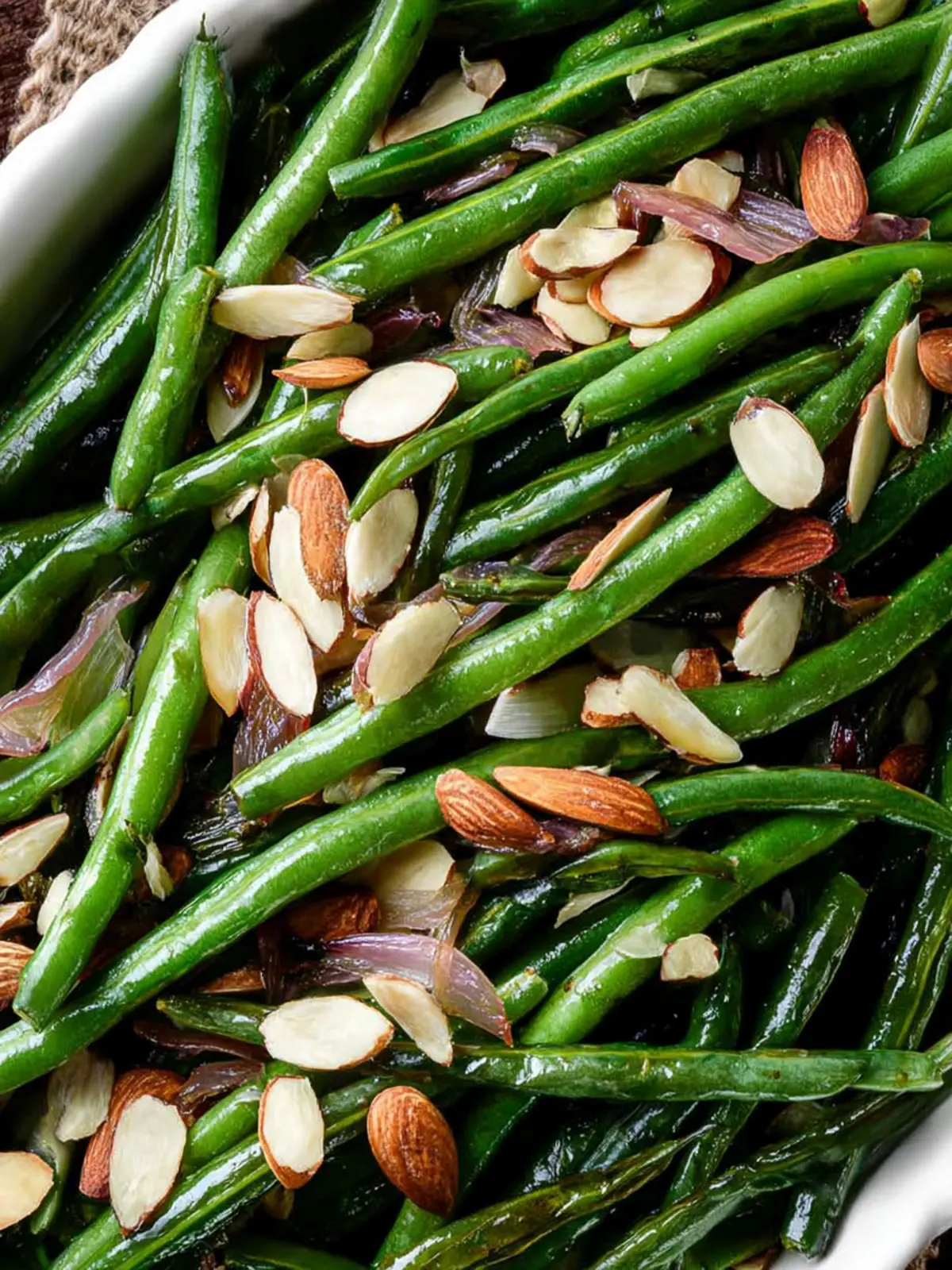 A delicious side dish featuring roasted green beans with shallots, garlic, and almonds.