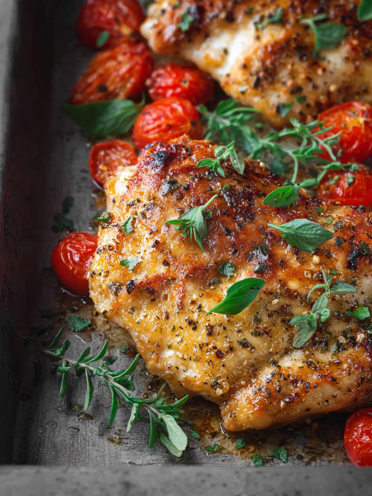 Juicy and flavorful oven-baked chicken breast, seasoned with herbs and served with onions and tomatoes.